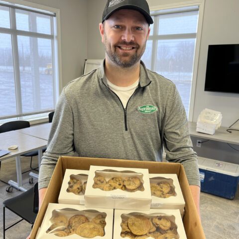 In Selby, a team including Jordan Taylor and Logan Orser from the crop administration team were joined by Tara Therian, Health and Safety Coordinator to make several batches of dough and scoop onto cookie sheets for freezing. Then Tara transported the frozen prepped cookies to the Trenton and Colborne locations for baking and boxing by additional team members like Ineke Veenstra, Customer Service and Agronomist Michael Cox and his kids. Brighton location had family members baking including Agronomist Sarah Wilson, and her daughter. Even IT Manager Leigh Blanchard was enlisted during a local visit, as he was tasked with delivering cookie orders to the Agromart head office near London Ontario. “Almost as often as the common cold, cancer has touched us all. Our customers, staff, peers, and families make ‘Cookies for Cancer’ a wonderful celebration of teamwork” said Karen Harder of the Brighton location.